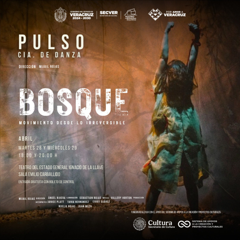 Xalapa, Ver., sábado 25 de abril de 2026.- La Secretaría de Cultura de Veracruz invita a disfrutar de las funciones de Bosque, Movimiento desde lo irreversible, bajo la dirección de Mijail Rojas, que se realizarán los días 28 y 29 de abril, en el Teatro del Estado General Ignacio de la Llave, en el marco del Día Internacional de la Danza. El acceso es gratuito con boleto de control.