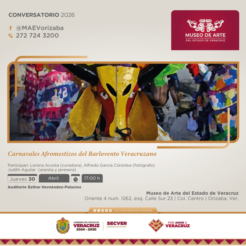 Xalapa, Ver., martes 28 de abril de 2026.- La Secretaría de Cultura de Veracruz invita a conocer la exposición Carnavales afromestizos del Barlovento veracruzano, del 30 de abril al 30 de agosto en la Sala Permanente de Arte Popular del Museo de Arte del Estado de Veracruz (MAEV), en Orizaba, de martes a domingo, en horario de 9:30 a 18:00 horas. La entrada es gratuita.