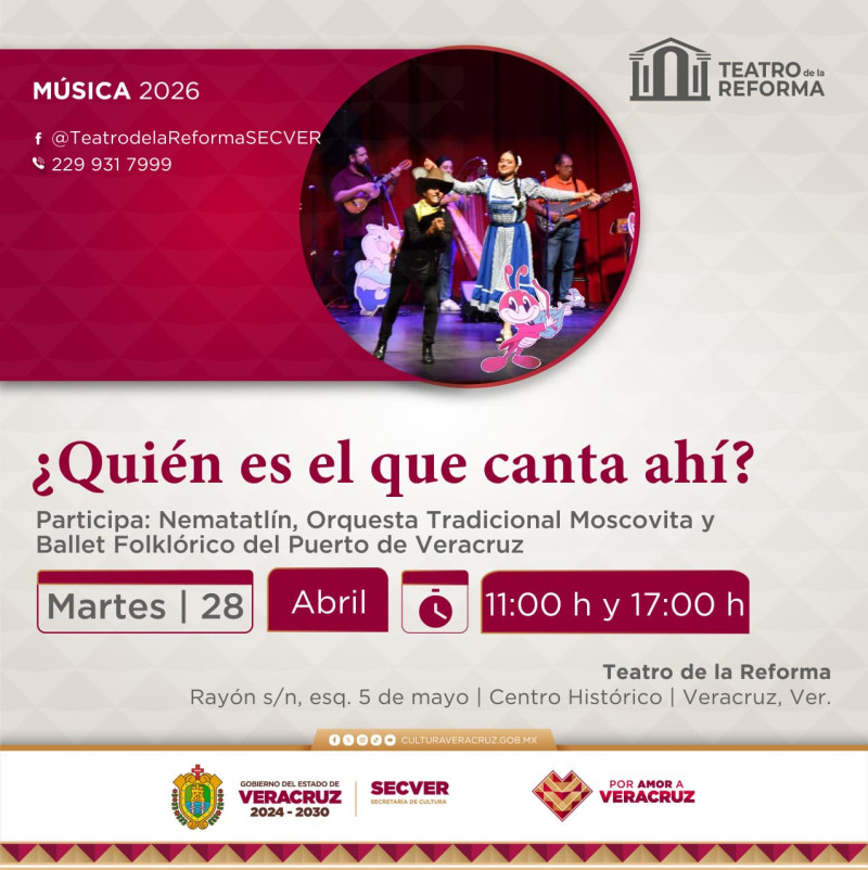 Xalapa, Ver., sábado 25 de abril de 2026.- La Secretaría de Cultura de Veracruz, en colaboración con la Dirección General de Difusión Cultural de la Universidad Veracruzana (UV), invita a la presentación artística ¿Quién es el que canta ahí? el próximo martes 28 de abril, en funciones de 11:00 y 17:00 horas, en la Sala Principal del Teatro de la Reforma, en el puerto de Veracruz. La entrada es gratuita.